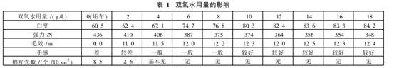 在前述的工藝流程和條件下,討論雙氧水用量對(duì)拉舍爾毯前處理效果的影響,如表1所示。