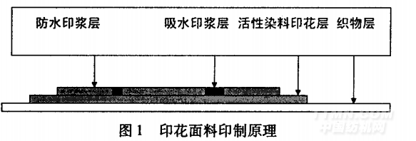 基布層為全棉織物,有較好的吸水性;第二層為活性染料(或其它染棉染料)印花層;第三層印有高吸水樹脂漿和防水助劑漿,分別用兩塊花版,印在活性染料印花層上。