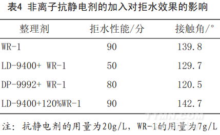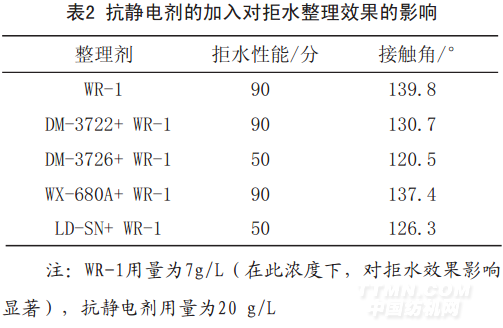 單獨(dú)進(jìn)行拒水整理織物抗靜電效果要略好于原布,這是由于拒水整理劑WR-1中含有一定量的—OH和酯基,當(dāng)WR-1在纖維表面交聯(lián)成膜后,由于這些基團(tuán)的親水作用,使得織物的抗靜電性能略好于未經(jīng)過(guò)整理的滌綸織物。由表3可看出,同浴整理比單純做抗靜電整理效果略有降低。這可能是由于WR-1在織物表面成膜過(guò)程中可能會(huì)把部分親水基團(tuán)屏蔽掉。2.2.2非離子型抗靜電劑與含氟拒水整理劑WR-1同浴整理