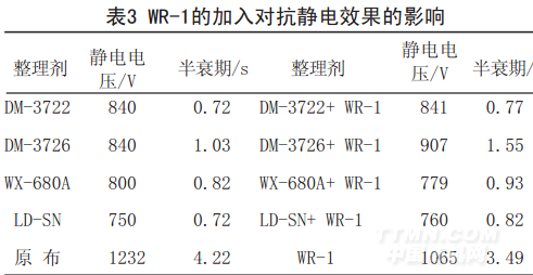 由上表知,DM-3726、LD-SN的加入使拒水效果顯著下降,由接觸角可看出,DM-3722、WX-680A的加入使拒水效果略有下降。由于抗靜電劑分子結(jié)構(gòu)中親水性基團(tuán)的存在,勢(shì)必會(huì)造成拒水效果的下降。