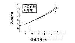 在100mL各含染色酸RS和冰醋酸pH值為4.6的溶液中分別加入一定體積0.025M燒堿或0.25%冰醋酸,測(cè)定溶液pH值的變化,結(jié)果如圖1、2所示。