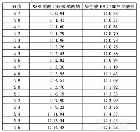 (2)采用染色酸RS1mL/L和100%醋酸鈉0.94g/L,復(fù)配組成pH值4.5的緩沖溶液,對(duì)外界帶入的堿性物質(zhì)(按100%NaOH計(jì)算),能承受的濃度極限為0.16g/L,比單獨(dú)使用染色酸RS要提高9.4倍;對(duì)外界帶入的酸性物質(zhì)(按98%醋酸計(jì)算),能承受的濃度極限為0.3g/L,比單獨(dú)使用染色酸RS要高6倍。