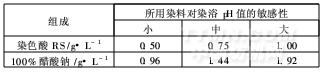 4.4 染色酸RS對酸堿的緩沖能力,與冰醋酸基本相同。若與強堿弱酸鹽(如醋酸鈉)復(fù)合使用,對pH值的緩沖能力會大幅度提高,足以消除外界帶入的酸堿性物質(zhì)對染浴pH值的影響,確保染浴pH值穩(wěn)定。