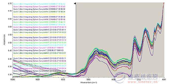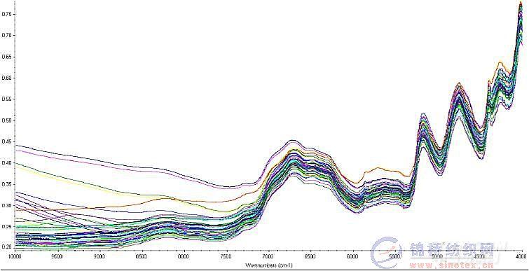 圖1 46個棉/氨樣品近紅外原始譜圖