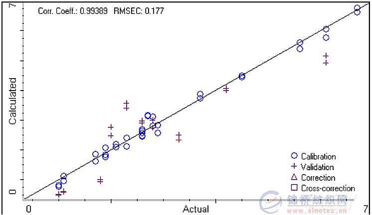 與棉含量參考值之間的分析模型。圖3為建模樣品預測值與參考值之間的相關圖,圖中橫坐標為樣品實際棉含量值、縱坐標為近紅外預測值。其中相關系數(Corr.Coeff.)越高(最高為1),校正均方差(RMSEC)越低,表示近紅外預測值與參考化學值越符合。