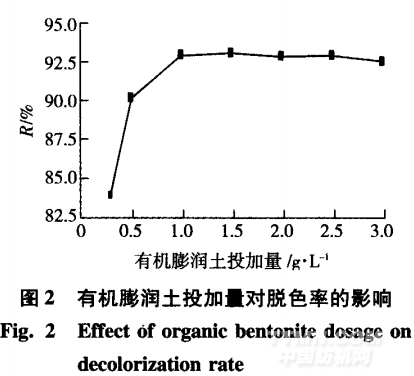 由圖2可知,當有機改性膨潤土投加量小于 1 g/L時,脫色率隨著投加量的增加而增大;當投加 量達到1.0 g/L時,脫色率最大,可達92.93%;當有 機膨潤土的投加量繼續(xù)增大時,模擬染料廢水的脫 色率趨于穩(wěn)定。這表明有機改性膨潤土投加量為 1.0 g/L時,對染料分子的吸附達到平衡。因此,有 機改性膨潤土的最佳投加量為1.0 g/L。