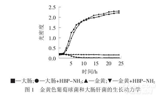 由圖1 可以看出,在HBP-NH2存在下,金黃色葡萄球菌和大腸桿菌的生長(zhǎng)受到明顯的抑制作用,表明HBP-NH2水溶液具有很好的抗菌活性.