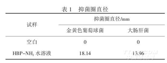 由表1 可知,空白樣的抑菌圈直徑均為0mm,HBP-NH2對(duì)金黃色葡萄球菌和大腸肝菌的抑菌圈直徑分別達(dá)到了18.14 mm、13.96 mm,說明HBP-NH2水溶液對(duì)金黃色葡萄球菌和大腸肝菌具有優(yōu)異的抗菌效果.