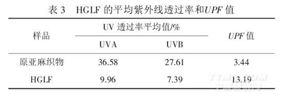 從表3可以看出,HGLF 在UVA(320~400 nm)和UVB(280~320 nm)段的平均紫外線透過(guò)率均降低,而UPF 值增加.其中,HGLF 屏蔽UVA、UVB 分別達(dá)到90.04%和92.61%,UPF 值從3.44 上升到13.19.由此可見(jiàn),HGLF 在一定程度上提高了亞麻織物的紫外線防護(hù)功能.