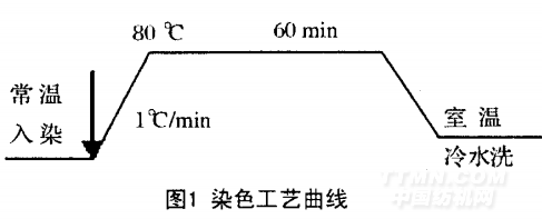 1.2.3染色工藝2g柞蠶絲在70℃溫水中浸漬10min,使其充分溶脹后,投入到浴比1:50的染浴中,分別選擇不同的pH值、溫度和濃度進(jìn)行染色實(shí)驗(yàn),染色時間60min。被染試樣經(jīng)過充分水洗后,測定其K/S值,得出最佳的工藝條件。染色過程的工藝曲線如下: