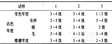 通過測(cè)定被染織物的牢度(表8)可知,試樣1和試樣2的牢度要明顯優(yōu)于試樣3,特別是變色牢度和摩擦牢度,沾色牢度三者之間的相差不明顯。