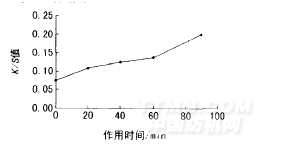 取水洗殘液100mL,加入等量的酸性液體纖維素酶,在恒溫?fù)u床上于50℃下進(jìn)行不同時間的沾色試驗,并測定相應(yīng)數(shù)據(jù)。