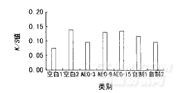 靛藍(lán)牛仔布沾色是因為靛藍(lán)染料再沉積作用造成的,加入表面活性劑或分散劑可以增加靛藍(lán)染料在本體溶液中的分散性能,從而減少其在織物上的沾附,減輕返染。采用不同的表面活性劑進(jìn)行沾色試驗,取水洗殘液100,l使用恒溫?fù)u床50℃處理60min,pH值為4.8,防沾色表面活性劑2g/L,測定相應(yīng)數(shù)據(jù),其中“空白1”是不加酶的,“空白2”僅加入酸性液體纖維素酶,AEO為脂肪醇聚氧乙烯醚。
