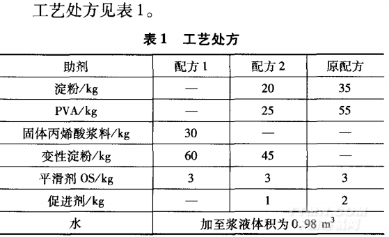 1.2工藝流程及條件 AC一238型自動絡(luò)筒機(jī)一zC—L型整經(jīng)機(jī)一S222 型漿紗機(jī)(漿液溫度95%,上漿車速40 m/min)一PAT —l90型噴氣織機(jī)。 打漿工藝條件:調(diào)漿時先放入適量的水,慢慢投入 固體丙烯酸漿料和其他助劑,攪拌25 min后,開汽加 熱至98℃,開小汽保溫30 min,然后定積悶漿。 上漿工藝條件:漿液溫度95℃,上漿車速40 m/min。