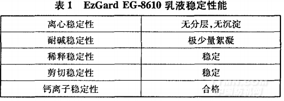 EzGard EG一8610乳液的各項(xiàng)穩(wěn)定性能指標(biāo)見表1。
