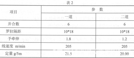 為加強纖維的混合及進一步提高纖維平行度,二道并條采用“緊隔距、重加壓”工藝原則,主要工藝參數(shù)見表2。