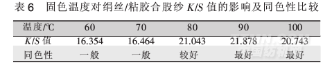 活性染料藍M-2GE染絹絲/粘膠合股紗,選定NaCl的用量為80g/L,改變?nèi)旧臏囟龋秒娔X測配色儀測定合股紗的表面深度(K/S值),比較染料在2種纖維上的同色性,結(jié)果見表6。