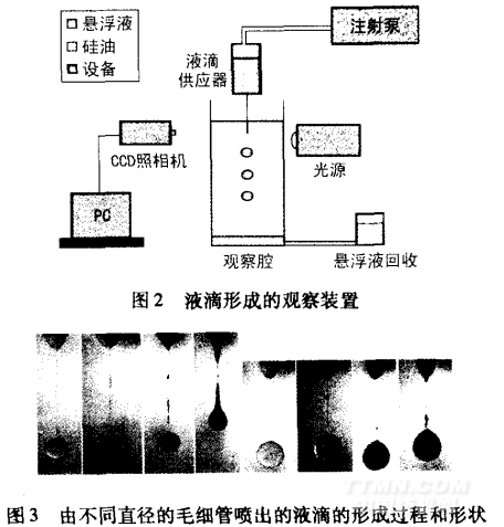 隨著科學(xué)技術(shù)的迅速發(fā)展,近年來很多科學(xué)家采用高速攝像手段,觀察了墨滴的噴出過程、形狀及其與織物相互作用的情況。美國佐治亞理工學(xué)院的w.W.Cart等采用圖2所示的裝置觀察了液滴的形成過程和形狀,得到如圖3所示的試驗結(jié)果,其中左圖為由直徑為5mm的毛細(xì)管噴出的液滴形狀,右圖為由直徑為2mm毛細(xì)管噴出的液滴形狀。