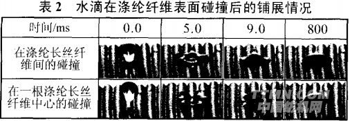 表2是水滴在滌綸長絲纖維表面的碰撞情況。從中可以看出,在同樣粗糙的滌綸纖維表面上,液滴碰撞的位置不同,所形成的液滴形狀也不相同。在碰撞之前(t=0.0ms),蒸餾水滴在不同基質(zhì)上呈球形;當(dāng)碰撞時間為5.0ms時,液滴在兩種不同纖維表面上的鋪展,無論在纖維的縱向還是橫向均得到最大鋪展;當(dāng)碰撞時間為9.0ms時,液滴進(jìn)入收縮階段;當(dāng)碰撞時間大于等于800ms時,液滴與纖維的碰撞達(dá)到平衡狀態(tài),但是液滴在滌綸纖維之間碰撞后所形成的鋪展直徑大于在纖維中心碰撞后所形成的鋪展直徑。這說明墨滴與纖維表面相互作用的位置也直接影響著噴墨印花圖案的質(zhì)量。