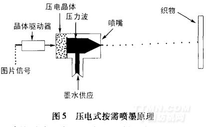壓電式按需噴墨(piezoelectricinkjet)的工作原理如圖5所示。噴頭中的壓電晶體根據(jù)輸入的電信號膨脹,擠壓墨水使墨滴從噴嘴中噴出,在織物上形成圖案。電壓信號消失后,壓電