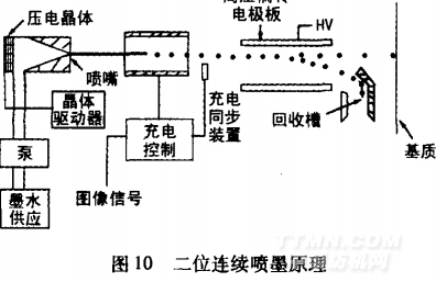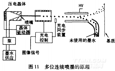 多位連續(xù)噴墨與二位連續(xù)噴墨的區(qū)別是,前者使墨滴帶不同的電荷,當(dāng)這些墨滴通過偏轉(zhuǎn)電極板的時(shí)候,可以發(fā)生不同的偏轉(zhuǎn),從而在基質(zhì)的多個(gè)位置上形成圖案,如圖11所示。用這種方法產(chǎn)生的墨滴直徑大約是噴嘴直徑的1.9倍,在有些情況下也會(huì)產(chǎn)生一些小的呈衛(wèi)星狀的墨滴,但是這些衛(wèi)星狀的墨滴會(huì)很快與墨滴流中的主墨滴合并。