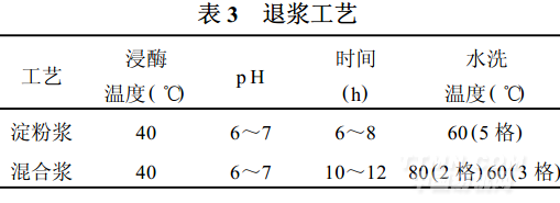 由于氨綸具有耐稀酸不耐熱堿液和濕熱處理時(shí)氨綸絲急劇收縮的特點(diǎn),可采用短流程冷軋堆酶退漿,對(duì)淀粉漿工藝條件可參照棉織物工藝:浸酶溫度40℃,pH 6~7。對(duì)混合漿在浸酶前先采用一格70℃熱水洗,再浸酶打卷,有利于混合漿的溶脹,時(shí)間10~12h,打卷不宜太緊,防止打卷時(shí)由于卷邊產(chǎn)生的壓痕難去除和沾色。退漿工藝見(jiàn)表3。