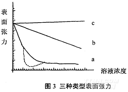作用在液體表面或同體表面的收縮力稱為表面張力,通常以達(dá)因/厘米(dyne/cm)或牛頓/米(N/m)來表示。兩相之問界面上的作用力稱界面張力,即表面張力。根據(jù)大量實(shí)驗(yàn)結(jié)果,符種物質(zhì)在水溶液中的表面張力可歸結(jié)為三種類型,如圖3所示,以溶液濃度為橫坐標(biāo),表面張力為縱坐標(biāo),得到三種不同的曲線。a類:如肥皂、洗滌劑等物質(zhì),在濃度很稀時(shí),表面張力隨濃度增加而急劇下降,降到一定程度后出現(xiàn)一個(gè)最低點(diǎn),又到一定數(shù)值后不再下降或下降很慢;b類:如乙醇、丁醇、醋酸等物質(zhì),表面張力隨濃度增加而逐漸下降,不會(huì)出現(xiàn)一個(gè)最低點(diǎn);c類:如NaCI、KNO3、NaOH等無機(jī)物,表面張力隨濃度增加而稍有上升。