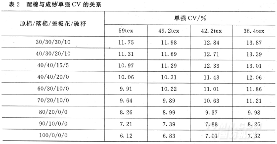 4tex轉(zhuǎn)杯紗,各種配棉成分的成紗單強(qiáng)CV值見表2。
