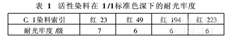 與普通紅色活性染料相比,高耐光牢度紅色活性染料屬于高檔染料,使用成本較高,只適用于中淺色織物染色。由于耐光牢度會隨織物上染料濃度的增加而提高,所以對于深色織物的染色,使用普通染料即能達到較高的耐光牢度。