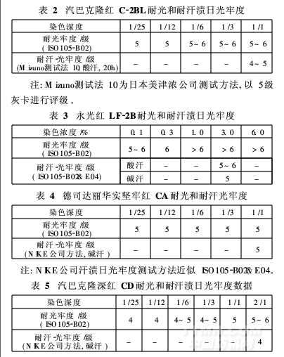 染料的母體結(jié)構(gòu)不僅決定了染料的顏色,而且對染料的耐光牢度也有影響[1]。紅色活性染料分子結(jié)構(gòu)中的偶氮基由于受相鄰的羥基和氨基等供電子基的影響,氮原子上的電子云密度相對較高,使偶氮基的耐光穩(wěn)定性大大降低,比較容易發(fā)生光氧化反應(yīng)。因此,紅色活性染料的耐光牢度一般都比較差。為了提高染料耐光牢度,染料廠商往往采用以下兩種方法對染料分子結(jié)構(gòu)加以改進[2]。一是在偶氮基的兩個相鄰位置引入羥基,利用其配位能力,與銅形成穩(wěn)定的螯合環(huán),提高耐光牢度。此類染料有C. I.活性紅23(如雷馬素紅3B、國產(chǎn)紅KN-5B)和C. I.活性紅49(如國產(chǎn)紅KN-B)。另一種方法是,在染料合成過程中采用“偶氮基保護技術(shù)”,即在偶氮基的鄰位引入強吸電子基,如磺酸基等,利用其吸電子效應(yīng),降低偶氮基氮原子的電子云密度,提高偶氮基的耐光穩(wěn)定性。此類染料有C. I.活性紅194(如國產(chǎn)紅M-2BE、B-2BF)、C. I.活性紅223(如國產(chǎn)艷紅M-GE)等。表1列出了文獻中上述紅色活性染料在1/1標準色深下的耐光牢度[3]。實際上,染料商提供的色卡上的耐光牢度往往低于表1的數(shù)據(jù),如國內(nèi)幾家活性染料廠商的產(chǎn)品色卡上標注的紅B-2BF,在標準色深下的耐光牢度僅4級,比染料索引上的數(shù)據(jù)低2級。德司達公司的雷馬素紅3B是高耐光牢度染料,在1/12標準深度時的耐光牢度能達到5~6級。由于該染料分子中含1. 6%的重金屬元素銅,耐汗?jié)n日光牢度較差,在1/1標準深度時,堿性耐汗?jié)n日光牢度僅3~4級,因此其應(yīng)用受到了一定限制。同屬于這種情況的還有德司達公司的麗華實紅玉CA。近幾年來,國內(nèi)外各大染料廠商相繼開發(fā)了新一代的高耐光牢度紅色活性染料。如汽巴精化公司的汽巴克隆紅C-2BL、臺灣永光公司的活性紅LF-2B,以德司達公司新近推出的麗華實堅牢紅CA等。這些染料的母體中都不含金屬元素,而是通過特殊的分子設(shè)計,使染料同時滿足耐光和耐汗光牢度要求。表2~4分別給出了汽巴克隆紅C-2BL、永光紅LF-2B和麗華實堅牢紅CA 3只染料的耐光和耐汗?jié)n日光牢度數(shù)據(jù)[4~6]。另外,汽巴精化公司推出汽巴克隆深紅CD活性染料,其固色率高達95%,而且在中等染色深度下具有極佳的耐光牢度和汗?jié)n日光牢度(見表5)[4]。
