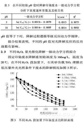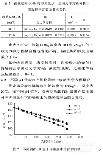 從圖2中可以看出,印染廢水的起始pH值為7 時(shí),降解液CODcr下降快。從對(duì)實(shí)際印染廢水做的平行實(shí)驗(yàn)結(jié)果看,初始pH值為原水pH值6·6時(shí),光降解效果最佳。堿性條件則不利于有機(jī)物的去除,其原因?yàn)?①TiO2在不同pH值的溶液中其ξ電勢(shì)不同,據(jù)文獻(xiàn)報(bào)道〔5〕,低pH值時(shí)的電勢(shì)為正(有利于帶負(fù)電荷的有機(jī)基團(tuán)的吸附)。而在堿性條件下TiO2的ξ電勢(shì)為負(fù)(不利于陰離子基團(tuán)的吸附)。對(duì)于印染廢水來(lái)說(shuō), 許多染料溶于水后都呈帶色的陰離子基團(tuán),因此適合在酸性條件下用TiO2光催化氧化法進(jìn)行處理。將不同pH值時(shí),石英砂負(fù)載TiO2薄膜在低壓紫外光光照條件下的印染廢水降解反應(yīng)用H-L動(dòng)力學(xué)方程按一級(jí)以最小二乘數(shù)法進(jìn)行擬合,結(jié)果列于表3。由表3可知, pH值=3或10時(shí),用一級(jí)反應(yīng)動(dòng)力學(xué)方程擬合,相關(guān)度R2很好。則不同pH值=3或10 的印染廢水的降解過(guò)程遵循一級(jí)反應(yīng)動(dòng)力學(xué)規(guī)律,而