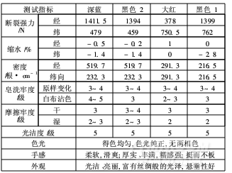注:斷裂強(qiáng)度布樣為5cm×20cm;縮水率是按美標(biāo)測試;皂洗牢度和摩擦牢度按國標(biāo)測定;光潔度根據(jù)燒毛級別來評定;色光和外觀按目測法評定;手感則采用觸摸法。