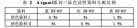 染色溫度是染色工藝的重要參數(shù),控制染色溫度可有利于提高染料向纖維內(nèi)部的擴(kuò)散、滲透性能。采用兩種或兩種以上的染料進(jìn)行拼色,首先考慮拼色的先決條件是選用上染速率基本一致的染料,當(dāng)拼色染料吸收速率不一致時(shí),吸收速率快的染料先在織物表面染著,后吸收的染料可能進(jìn)入織物組織內(nèi)部。這是隨著溫度升高,纖維膨化后,殘留在染浴中的染料向纖維內(nèi)部的吸收速率反而大于先吸收染料的擴(kuò)散速率之故,易造成染色不勻;本試驗(yàn)選用的三原色染料具有良好的配伍性和上染同步性,染料互配比例見表2。