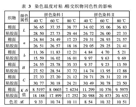 拼色染料對(duì)粘/棉交織物分別進(jìn)行40, 60和80℃浸染,其顏色數(shù)據(jù)見表3。