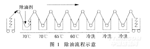 除油在連續(xù)平幅水洗機(jī)中進(jìn)行,坯布在無張力的情況下完全松弛,達(dá)到尺寸穩(wěn)定,左中右、頭中尾各處克重一致。除油槽中加除油劑Humectol LYS(不含APEO)2 g/L,溫度為70℃,織物先經(jīng)熱水處理,再經(jīng)幾道逐級降溫?zé)嵯春屠湎?出布落車,上定形機(jī)進(jìn)行高溫預(yù)定形。除油流程如圖1。