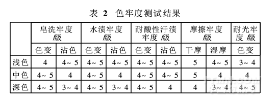 對大生產(chǎn)尼龍三角絲彈力織物進(jìn)行了皂洗牢度、水漬牢度和耐摩擦等牢度測試,結(jié)果見表2。