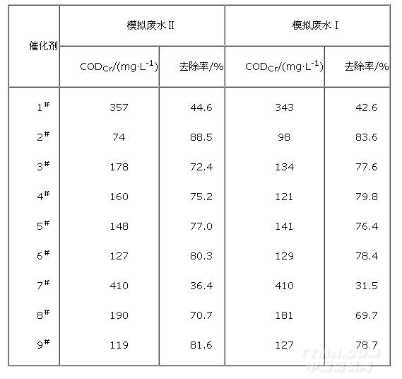分別取模擬廢水Ⅰ和Ⅱ各100 mL,投加二氧化氯溶液2 mL(1.0%的水溶液)和自制催化劑(浸漬染料廢水)4.0 g,調(diào)節(jié)水樣的pH=3~5,室溫下振蕩反應(yīng)60 min。測定反應(yīng)后的CODCr值,計(jì)算CODCr去除率,結(jié)果見表2。