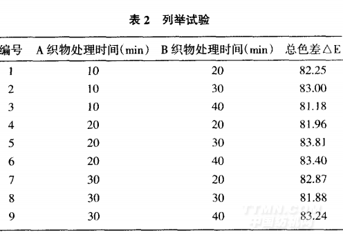正交實驗 為了進一步比較超聲波處理織物和染液對織物上 染率的影響,分別選取織物進行超聲波處理的時間、染 液進行超聲波處理的時間進行試驗,各因素選取1.5中 單因素試驗上染率較優(yōu)的兩變量進行正交試驗,表頭設 計如表1所示,以Na2s0 為促染劑,Na CO,為固色劑, 染色浴比為l:20,測定各組染色織物總色差△E值。列 舉試驗見表2。