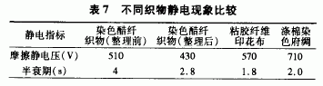 柔軟整理前后醋纖織物的靜電指標及與其它品種比較見表7。
