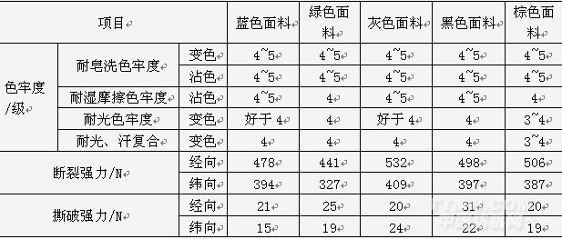 由表2的檢驗數據可以看出,所檢測面料的耐皂洗、耐濕摩擦色牢度均能達到4級 及以上;耐光和耐光汗復合色牢度不低于3~4級,色牢度都要高于一般產品標準一等品的要求。斷裂強力遠高于一般織物≥150 N的要求,撕破強力也高于一般織物≥10 N的要求。