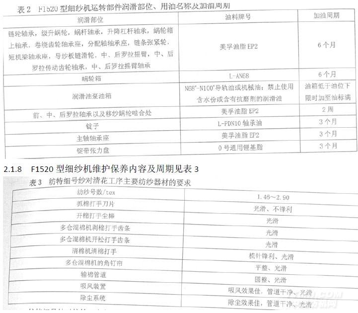 2.1.7滴油潤滑裝置在排除故障,調(diào)整油量或進行手動供油時,必須切斷電源,使油泵排油一次完成,活塞完全復(fù)位后。再進行操作。F1520型細紗機運轉(zhuǎn)部件潤滑部位、用油名稱及加油周期見表2。
