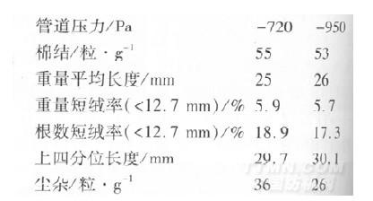 使用凝棉器時(shí),一般要求塵籠內(nèi)部處于較低的負(fù)壓狀態(tài),既有利于排除原料中的微塵和超短短絨,又不影響皮翼剝?nèi)∞D(zhuǎn)移纖維。在FAll3B型開棉機(jī)的使用中,一般要求出棉口壓力為?320 Pa~?500 Pa。為了保證良好的除雜效果,可以適當(dāng)提高FAll3B型開棉機(jī)除塵管道的壓力,使落雜箱內(nèi)處于一定的負(fù)壓狀態(tài),在開松打擊力度不變的情況下,不但可以提高排除短絨雜質(zhì)的能力,而且還能有效保持落雜箱內(nèi)的清潔。