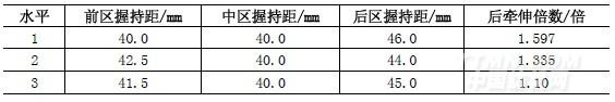 2.1對(duì)影響質(zhì)量的主要工藝參數(shù)、羅拉握持距、后區(qū)牽伸倍數(shù)等因素做了四因素三水平正交試驗(yàn)