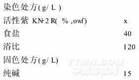 活性染料染色工藝流程(一浴二步法)、布樣→染色(60℃×15min→加1/2NaCl,15min→加1/2NaCl,15min)→固色(Na2CO315g/L,浴比1∶20,時(shí)間30min)→皂洗(92℃×5min)→水洗→烘干