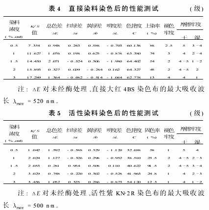 表4、5中的ΔE提供總的色差數(shù)據(jù),結(jié)合L(亮 暗)、A(紅 綠)和B(黃 藍)值的變化,即Δa值為正偏紅、負偏綠;Δb值為正偏黃、負偏藍。棉織物經(jīng)酶處理后染色,隨染料濃度增加,K/S值增大,但上染率或固色率減小。直接染料染色的棉織物,當染料濃度為0.5%時,上染率最大;濃度為1.5%時,鮮艷度值和色差值最大?;钚匀玖先旧蘅椢?染料濃度為1.5%時,固色率最大,色差值最小。染料濃度變化對染色牢度的影響不大,但濃度過高時,濕摩擦牢度偏低。