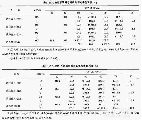 (1)從表1可看出,在60℃條件下打浸染樣時(shí),達(dá)到染色平衡所需的固色時(shí)間相對(duì)較長(zhǎng).淺色(0.5%,owf),需60rain左右,深色(3%,owf),需80min左右。顯然.13常打浸染樣的固色時(shí)間(淺色30-40min.深色40~50min),是達(dá)不到染色平衡的。其得色深度與達(dá)到染色平衡時(shí)相比,一般要低5%一l2%。而且,染料的品種不同,得色深度下降的幅度還不一樣。