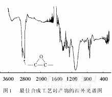 從原料和產(chǎn)物的紅外光譜分析可以看出,改變反應條件對反應進程和終產(chǎn)物純度的影響。其中,最佳合成工藝條件下的產(chǎn)物譜圖中有較明顯的環(huán)氧基特征峰(見圖1),證明反應是向所設計的方向進行的[4]。采用鹽酸丙酮法測定產(chǎn)物的環(huán)氧值為0.598mol/100g,而理論值為0.735mol/100g,由此說明單元數(shù)n>1,產(chǎn)物是多種分子量的混合物。