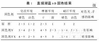 從表1可以看出,經(jīng)固色劑TX處理后,直接染料的各項牢度可以提高1~2級,說明固色劑TX對提高直接染料染色品的濕處理牢度有明顯效果。但也有不足,如固色后的色光較原樣略顯萎暗。