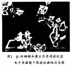 JSM一56000LV掃描電子顯微鏡下觀察B一環(huán)糊精和薰衣草香精微膠囊的微觀形態(tài),其結果見圖1。