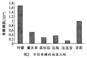 香精閾值是反映香精持久性和強度的一個指標,它可分為檢測閾值和分辨閾值。檢測閾值是指香精不能夠分辨出其氣味時的濃度采用溶解稀釋方法測得茉莉香精,玫瑰香精,薰衣草香精,森林浴香精和檀香香精的閾值大小比較見圖2所示